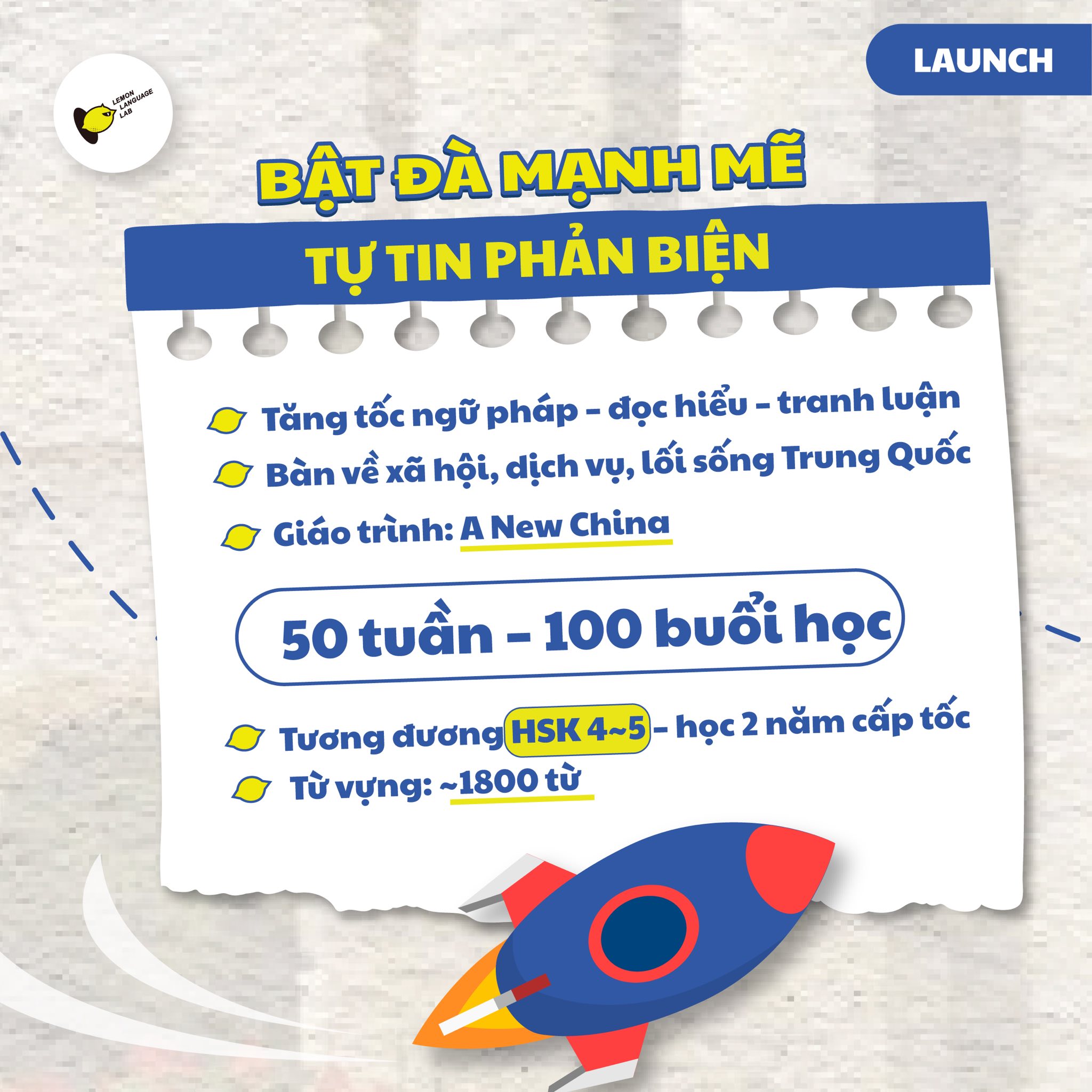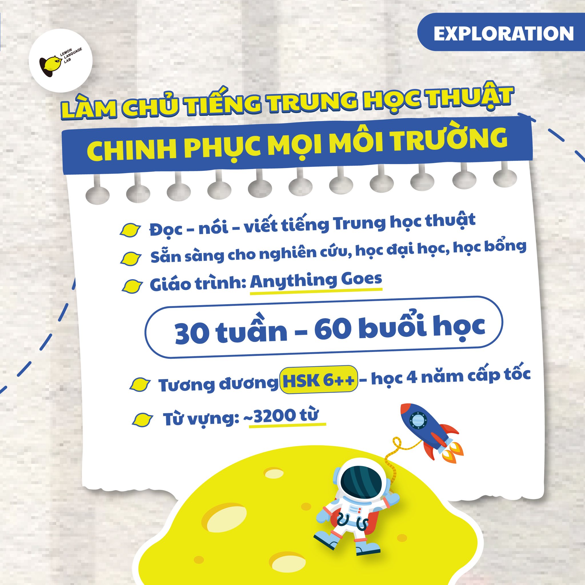 Lemon Language Lab hội tụ tinh thần tươi mới, kết nối và trải nghiệm, mang đến môi trường học tiếng Trung sống động, nơi mỗi bé được tự do khám phá, thử thách bản thân và biến ngôn ngữ thành công cụ mở ra cơ hội thực sự trong học tập lẫn cuộc sống…